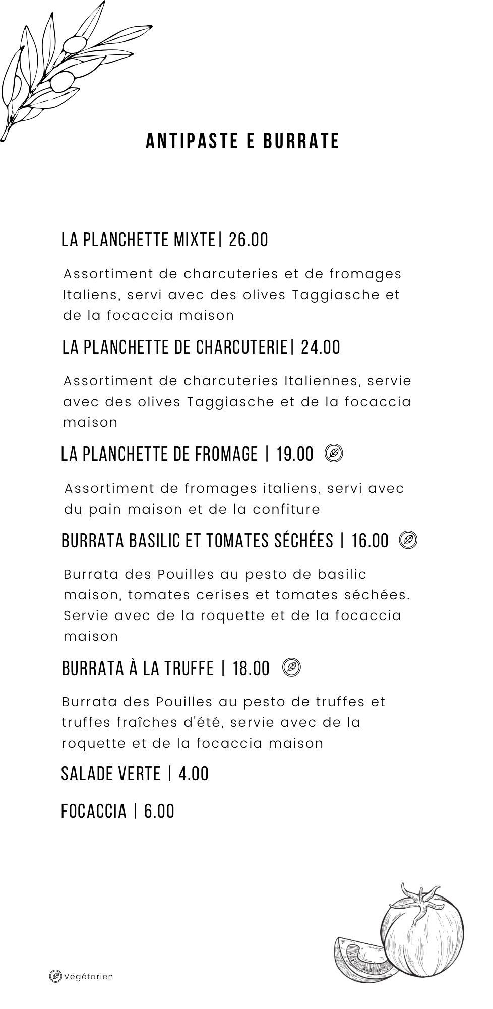 Pasta, pizza napolitaine, anti pasti, dessert et une sélection de vin italien pour accompagner le tout. Venez découvrir notre belle carte !
